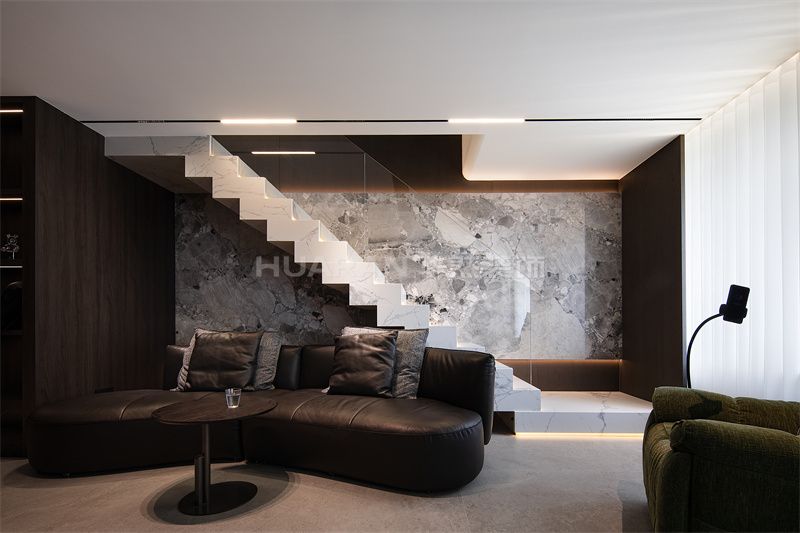 楼梯采用玻璃扶手与大理石背景,现代感十足