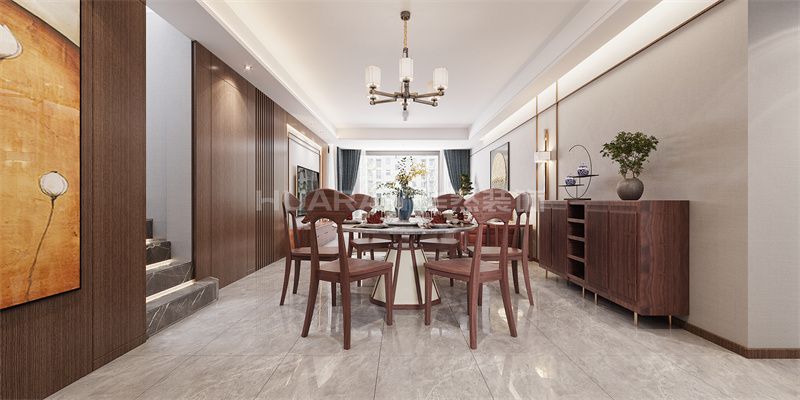 本案例为新中式风格住宅,以木色、浅灰为基底,融入中式元素。客厅红棕沙发搭配山水纹地毯,金色装饰画、中式吊灯增添典雅韵味。餐厨区圆形餐桌配木质餐椅,与客厅风格统一。卧室蓝墙、圆形挂画营造静谧氛围,家具简约不失东方意境。空间利用线条、材质融合传统与现代,既保留中式美学底蕴,又贴合当代居住习惯,打造出温馨且具文化气息的居住环境 。