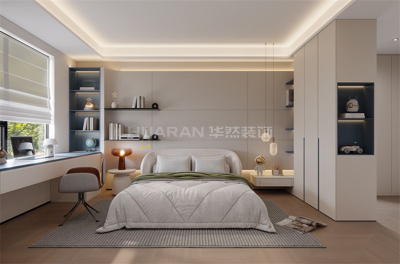 本案例为现代简约风格住宅,以浅色调为主营造通透感。公共区域开放式布局,弧形元素、艺术摆件增添灵动;儿童区整合玩乐与阅读功能,长颈鹿造型书架童趣十足。卧室借悬浮床头柜、嵌入式收纳优化空间;主卧连通休闲区,大窗引景,传递松弛氛围。全屋以简洁线条、实用设计,融合温馨与时尚,诠释舒适宜居的现代生活美学。