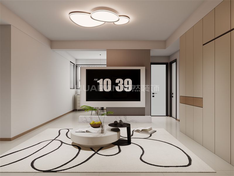 本案例为现代简约风格家装设计,以米白、浅棕为主色调,营造出简洁舒适的氛围。客厅采用无主灯设计,搭配造型独特的吊灯,光线柔和。米色沙发搭配同色系茶几,简约大气。电视背景墙设计新颖,嵌入大屏,增添了空间的时尚感。卧室延续整体简约风格,浅棕木质背景墙与米色床品形成对比,营造出静谧舒适的睡眠氛围。床头的小吊灯与窗边的梳妆台,为空间注入了精致感。整个空间通过简洁的材质运用、合理的功能布局以及巧妙的色彩搭配,将现代简约风格的优雅与舒适展现得淋漓尽致。