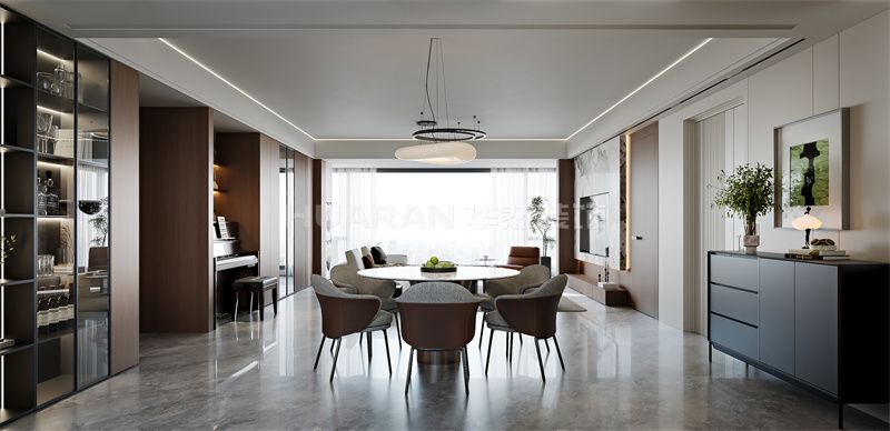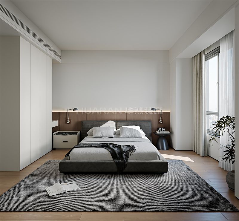 本案例为现代简约风格家装设计,以灰白、木色为主色调,营造出简洁大气的氛围。公共区域采用开放式布局,客厅白色沙发搭配造型独特的吊灯,简约时尚。餐厨区圆形餐桌搭配棕灰餐椅,实用美观,与客厅衔接自然。卧室延续整体风格,深灰床具与浅灰床品结合,木色背景墙增添温馨感,大窗户引入充足自然光。全屋通过简洁线条、高级色调与合理空间规划,打造出兼具质感与舒适的居住体验。