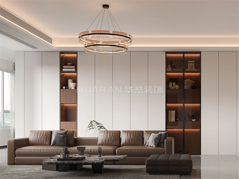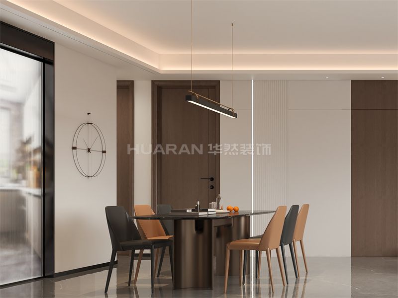 本案例为现代简约风格家装设计,以米白、深棕为主色调,营造出雅致大气的氛围。公共区域采用开放式布局,客厅深棕皮质沙发搭配造型独特的吊灯,简约大气。餐厨区与客厅相连,深色餐桌椅与橱柜结合,精致摆件点缀其间,尽显质感。卧室延续整体风格,浅色系床具与柔和床品结合,设有书桌,兼具休憩与工作功能。全屋通过简洁线条、深色木质元素与合理空间规划,打造出舒适且具格调的居住体验。