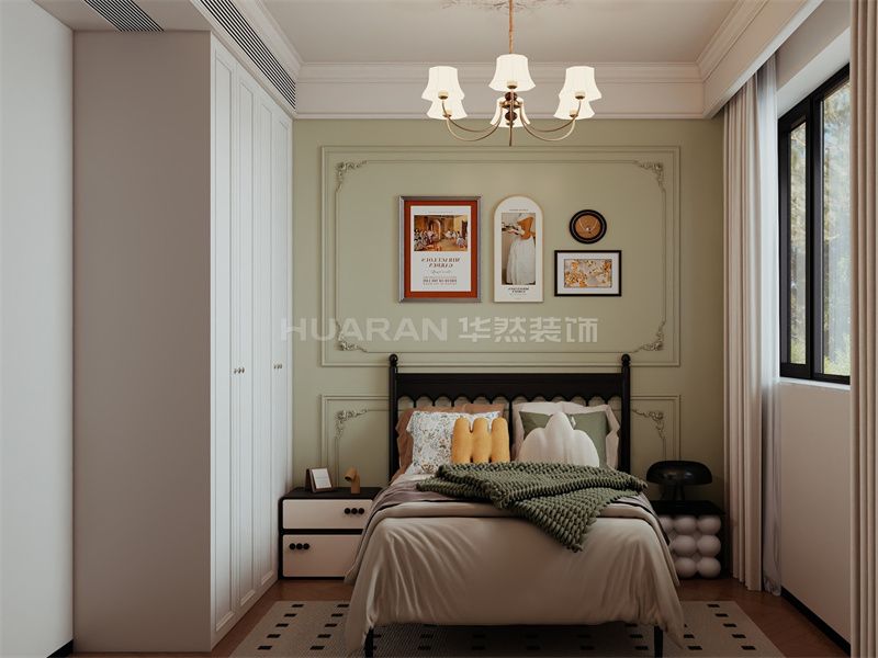 卧室采用雕花吊顶、复古吊灯,墙面装饰画与PU线条结合,既体现法式的艺术感,又通过定制衣柜满足收纳需求,床头的复古家具与软装搭配,强化了空间的复古调性。