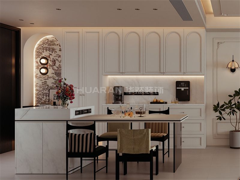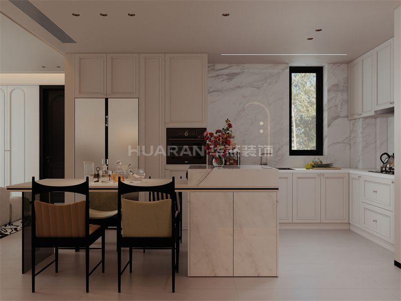 厨房以白色橱柜搭配大理石纹理,嵌入高端厨电,岛台与餐桌一体化设计,兼顾烹饪与社交功能,整体呈现出优雅且实用的餐厨空间。