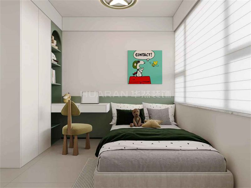 本案例为现代简约风格家装设计,以米白、木色为主色调,营造出简洁舒适的氛围。儿童房采用清新绿白配色,史努比挂画增添童趣,书桌与储物柜满足学习收纳需求。公共区域布局开阔,客厅墨绿色沙发搭配艺术挂画,线条柔和。餐厨区木质餐桌与米色餐椅结合,采光良好,长形吊灯提升格调。全屋通过简洁线条、自然材质与合理空间规划,打造出舒适且具质感的居住体验。